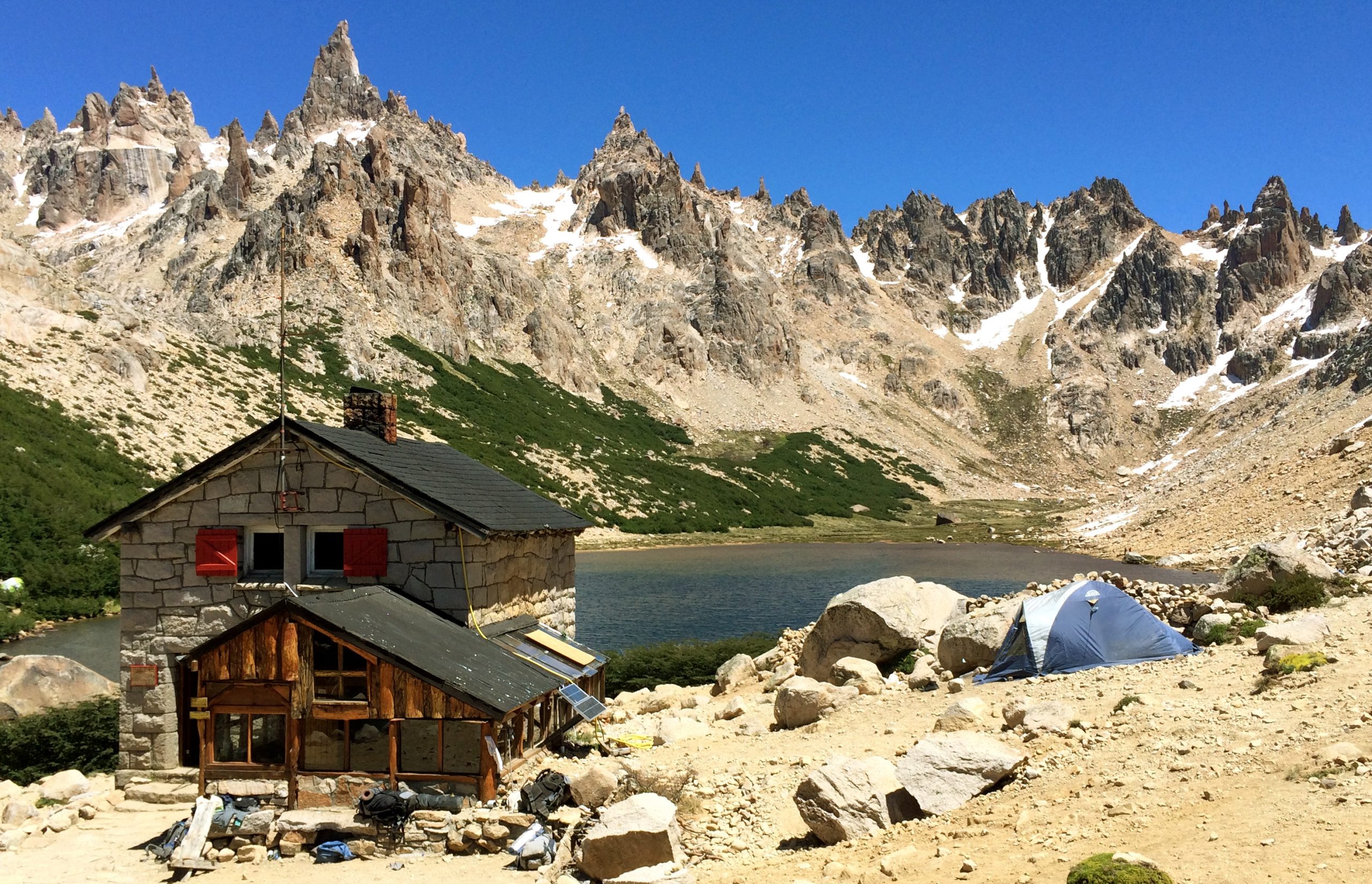 El refugio Emilio Frey está ubicado al pie de la aguja Frey, rodeado de torres y agujas rocosas y a orillas de la laguna Toncek de verdes y frías aguas, a 1700 msnm.